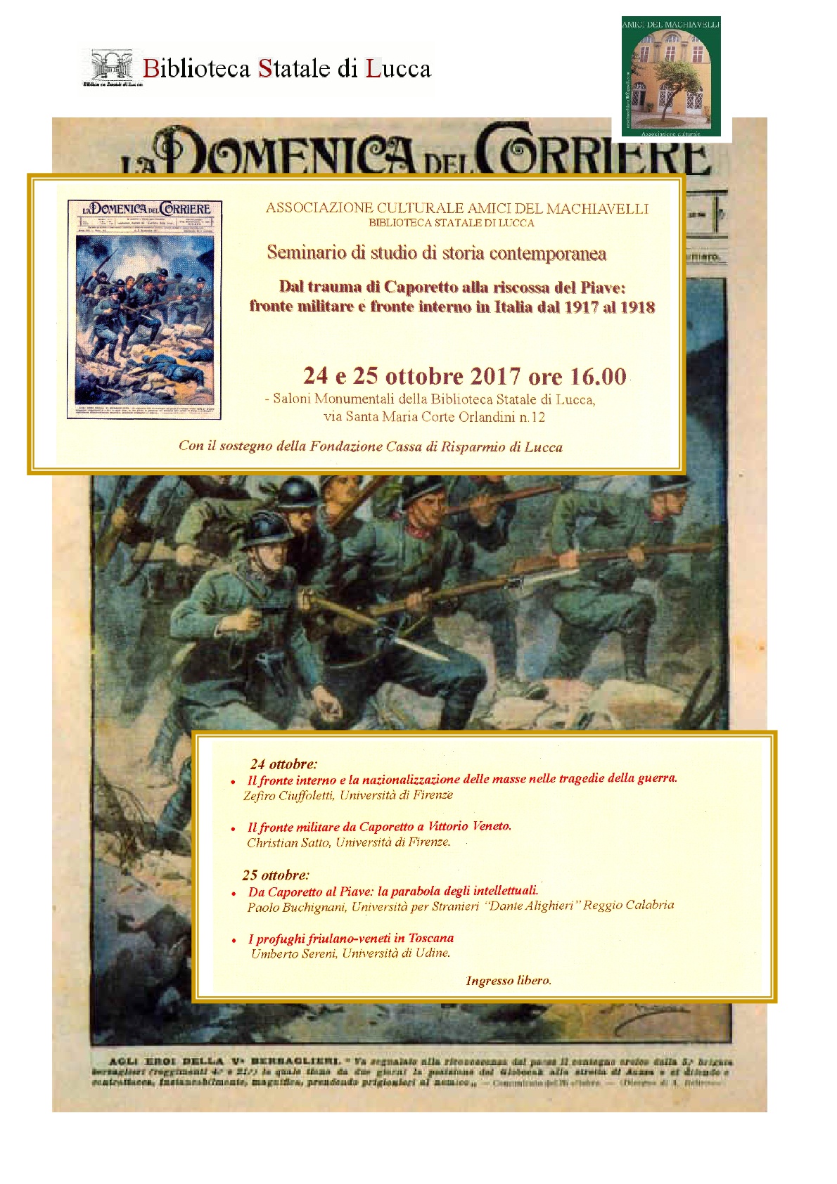 In occasione del centenario della battaglia di Caporetto che si combatté tra il 24 e il 25 ottobre 1917, la Biblioteca Statale di Lucca e l'Associazione culturale Amici del Machiavelli organizzano nelle medesime date il Seminario di studio di storia contemporanea "Dal trauma di Caporetto alla riscossa del Piave: fronte militare e fronte interno in Italia dal 1917 al 1918".